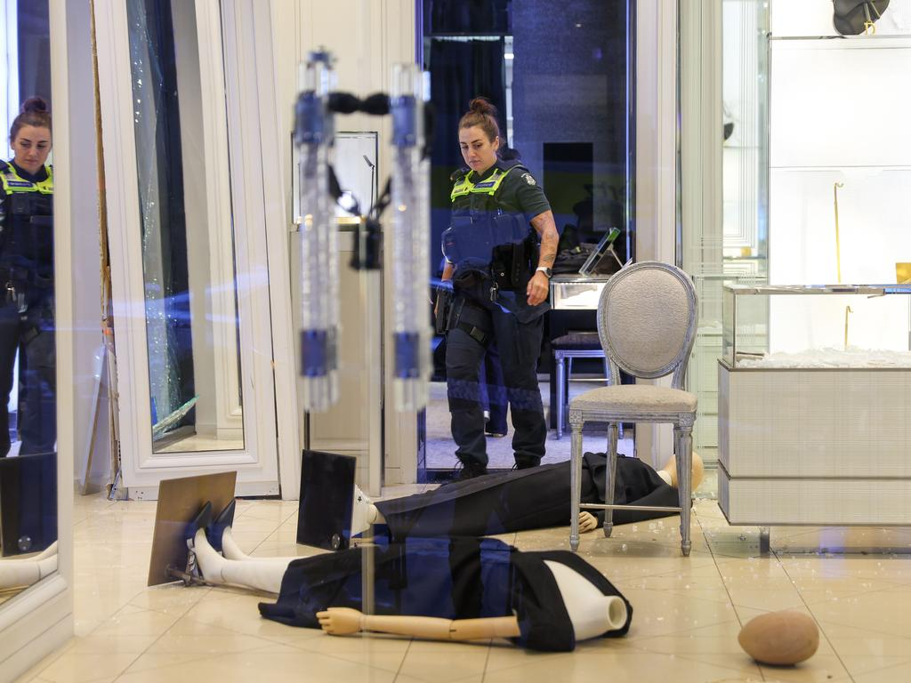 进入店内后,窃贼砸碎了玻璃展示柜,盗走了大量商品,随后乘坐另一辆车逃离现场。