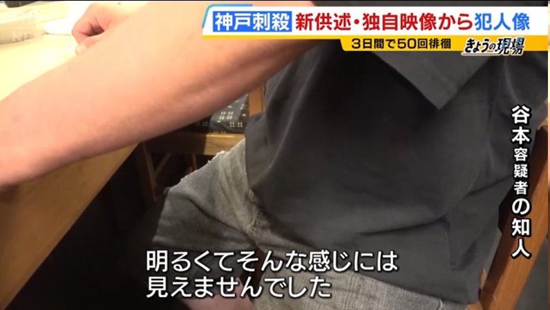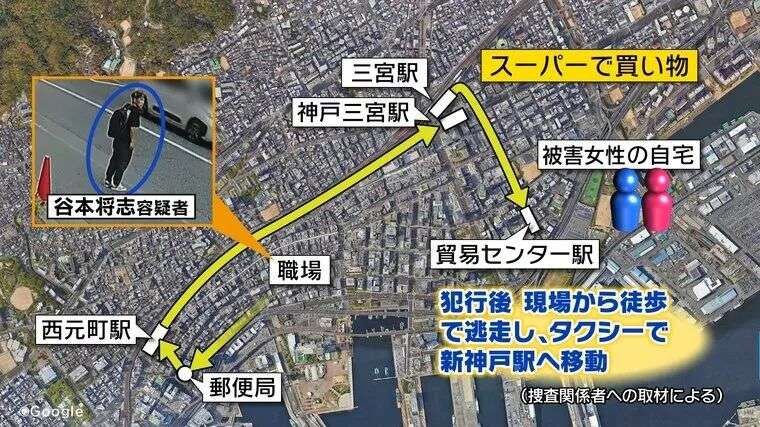 犯案后逃离现场的谷本一直逃跑,从新神户站乘坐新干线前往东京,在JR奥多摩站下车,22日在奥多摩町的街道上被确认。