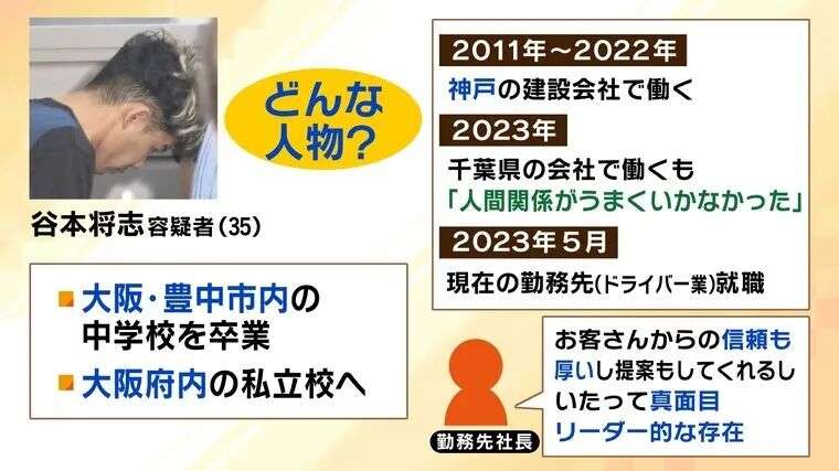 据了解,谷本将志从大阪府丰中市内的中学毕业后,进入大阪府内的私立学校。2011年到2022年期间,一直在神户的一家建筑公司工作。2023年,他在千叶县的公司工作,但因人际关系不和辞职,同年5月开始在现在的东京都内的公司从事司机工作。
