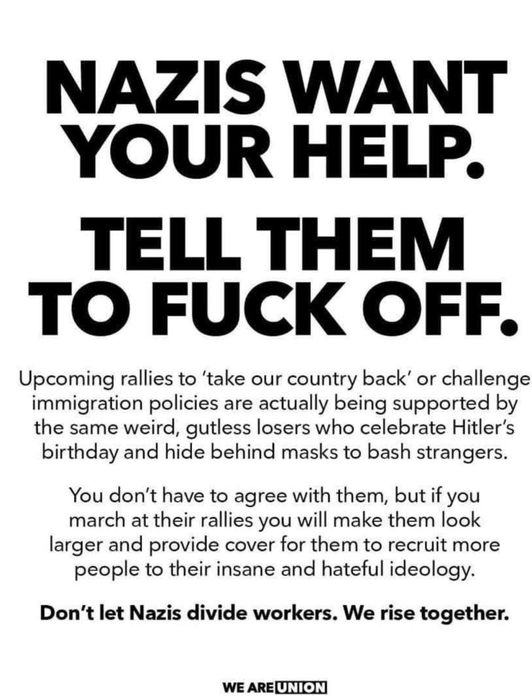 这些人做出海报,在网上传播,提醒大家:那些号称要“夺回国家”或反对移民政策的集会,其实是由一些极端分子、新纳粹在背后推动。