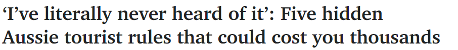 Ref: https://www.heraldsun.com.au/news/national/ive-literally-never-heard-of-it-five-hidden-aussie-tourist-rules-that-could-cost-you-thousands/news-story/2f543dfd262329500842653150675ada