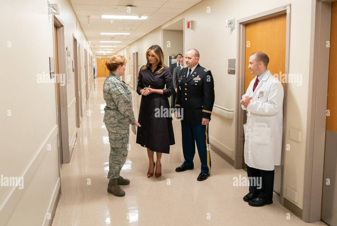 其实只要稍微翻下互联网就可以查到,上面这张照片来自2019 年 5 月 22 日,梅拉尼娅·川普在马里兰州贝塞斯达访问纪念阵亡将士纪念日期间,会见了沃尔特·里德国家医疗中心的医务人员。