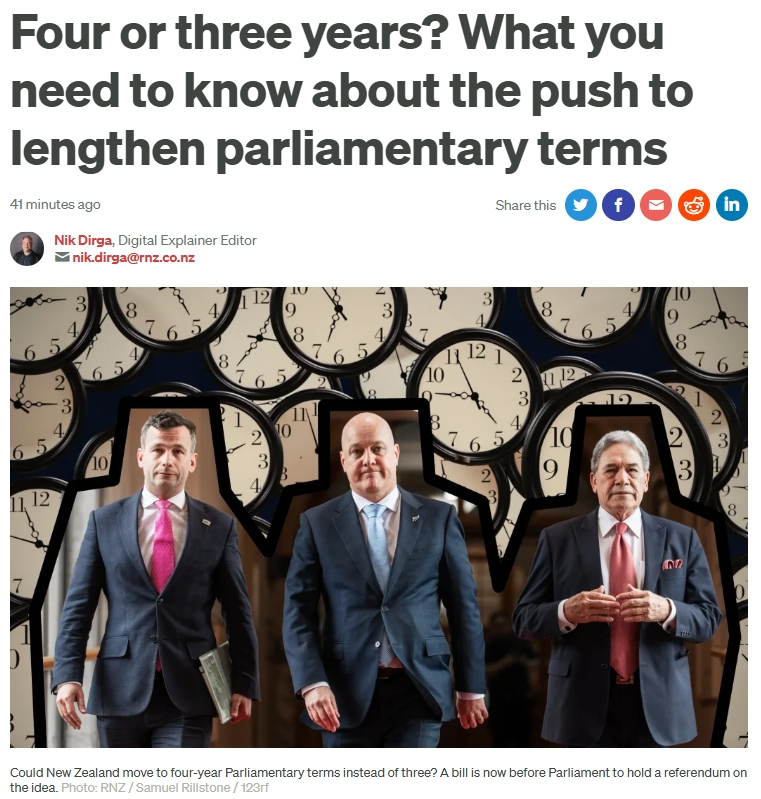 新西兰(以及澳大利亚)实行三年议会任期,在全球范围内相对罕见。更多国家采用四年或五年。