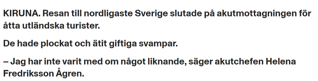基律纳,这个瑞典最北端的小城,平时以极光和滑雪出名,安安静静,最多的突发事件也就是哪家驯鹿又跑进超市门口晃悠。但这几天,当地的新闻头条被一件“闻所未闻”的突发事故霸占——八名中国游客因为吃了野生蘑菇,集体被送进医院。