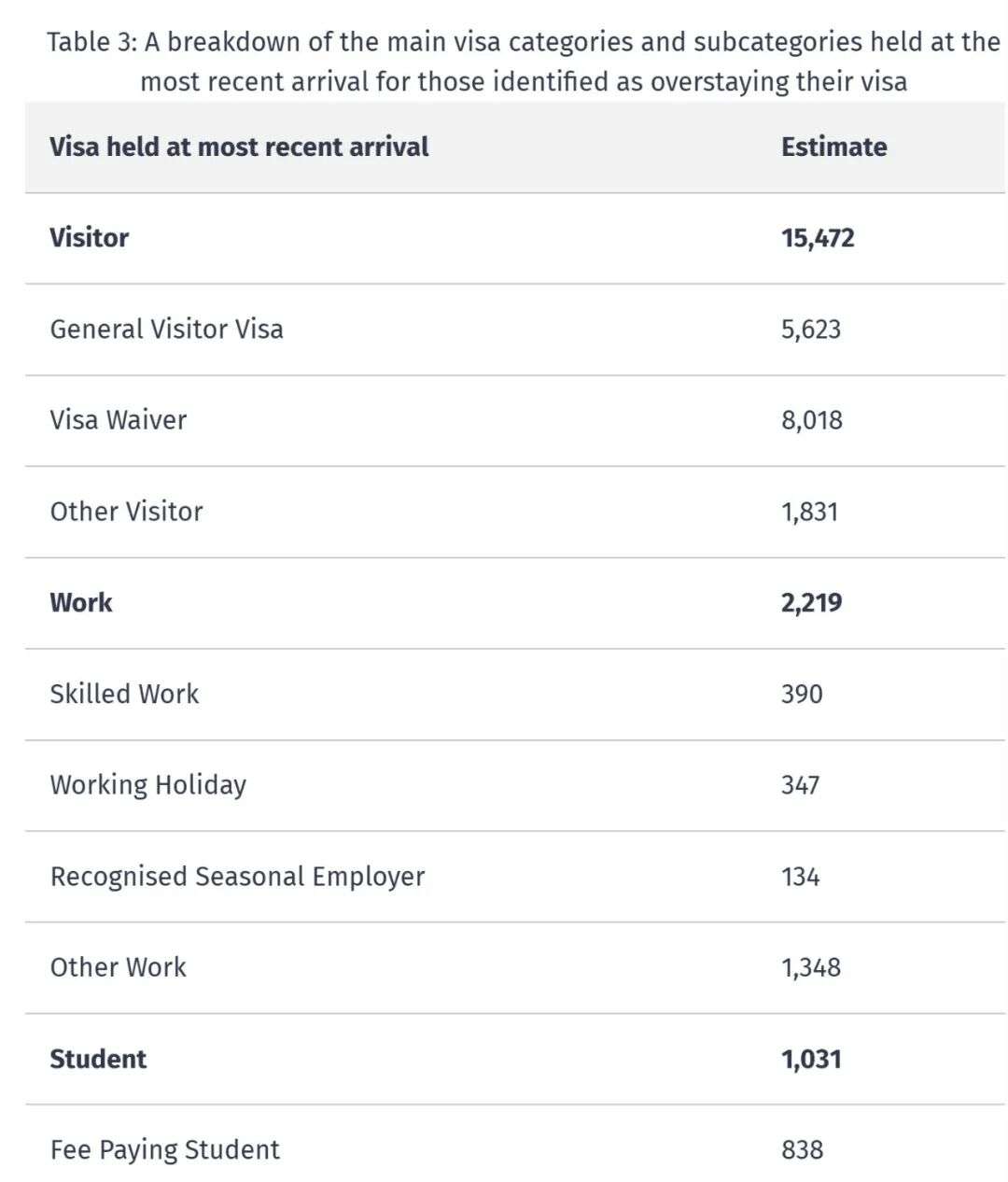 从总的数字看,多数逾期滞留者持有访客签证(15,472),少数持工作签证(2219人)或学生签证(1031人)。见下表: