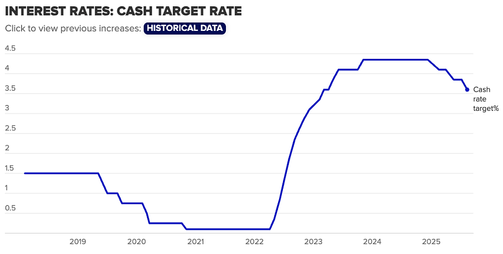8月,澳联储利率下调25个基点至3.6%