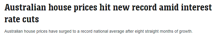 全澳房价已连续八个月上涨,在降息和供应紧缺的双重推动下,房价创下历史新高!