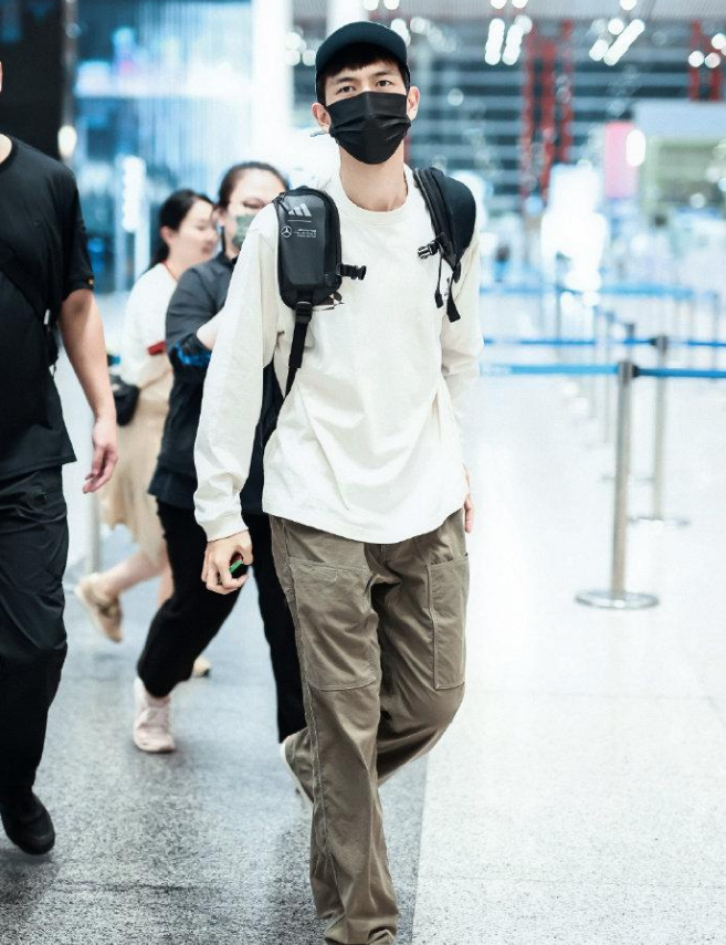 李现穿着白T、黑短裤,背着双肩包,清爽减龄,被粉丝调侃是“青春男大生”。