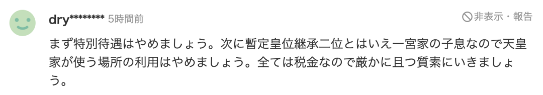 “首先请停止特殊待遇!再说就算暂居皇位继承第二位,终究只是宫家子弟,请停止使用专供天皇家族的场所。所有开销都是税金支付,请庄严且简朴地行事!”
