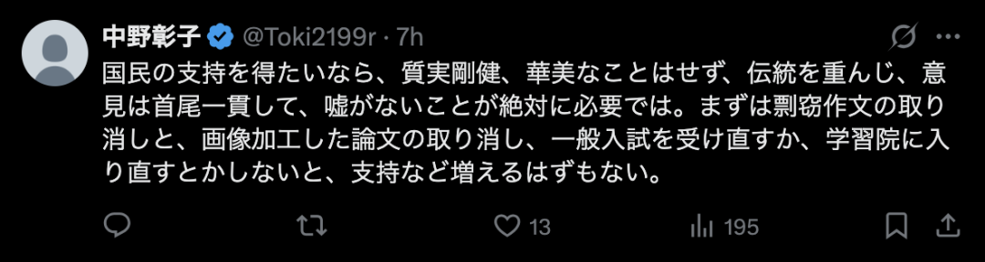 “要想获得民众支持,他绝对需要朴实坚强,不浮夸,尊重传统,坚持己见,诚实待人。首先,他必须撤回抄袭的论文和被篡改的试卷,要么重新参加普通入学考试,要么重新进入学习院,否则他不可能获得更多支持。”