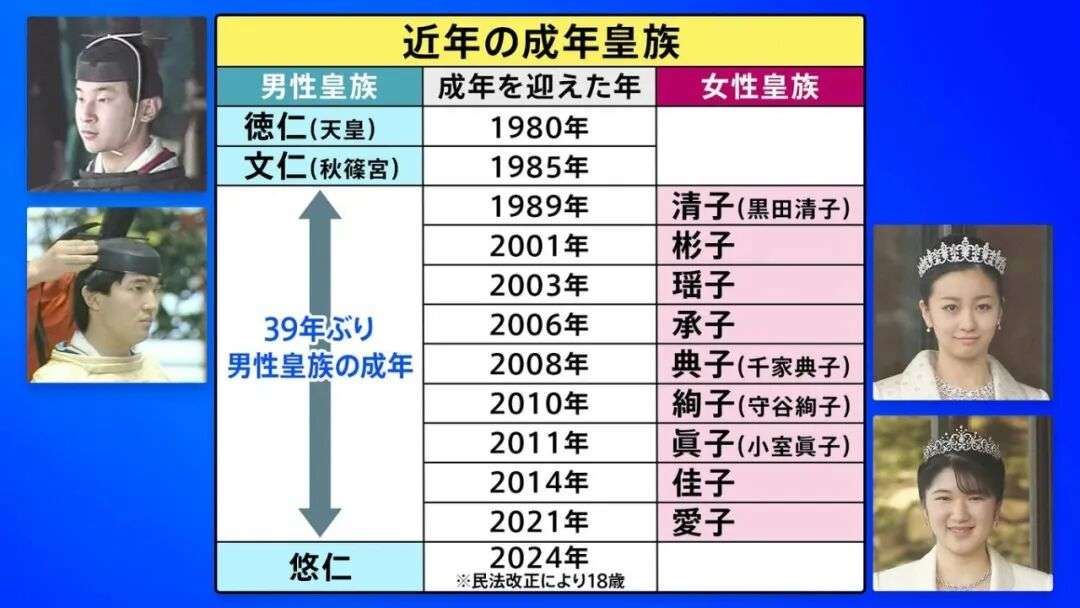 而且皇室女性一般是没有隆重的成年礼的,爱子公主和悠仁的姐姐佳子公主成年时,虽然举行了新闻发布会、被授予勋章,但没有举行任何仪式。