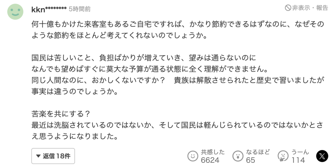 “花费了数百亿建造的皇室住所明明就可以使用,应该能节省不少开支,为什么几乎完全不考虑这类节约方案呢?国民生活日益艰难,负担不断加重,诉求却得不到回应。而有些人无论提出什么要求,总能立刻获得巨额预算批准,这种状况实在令人无法理解。