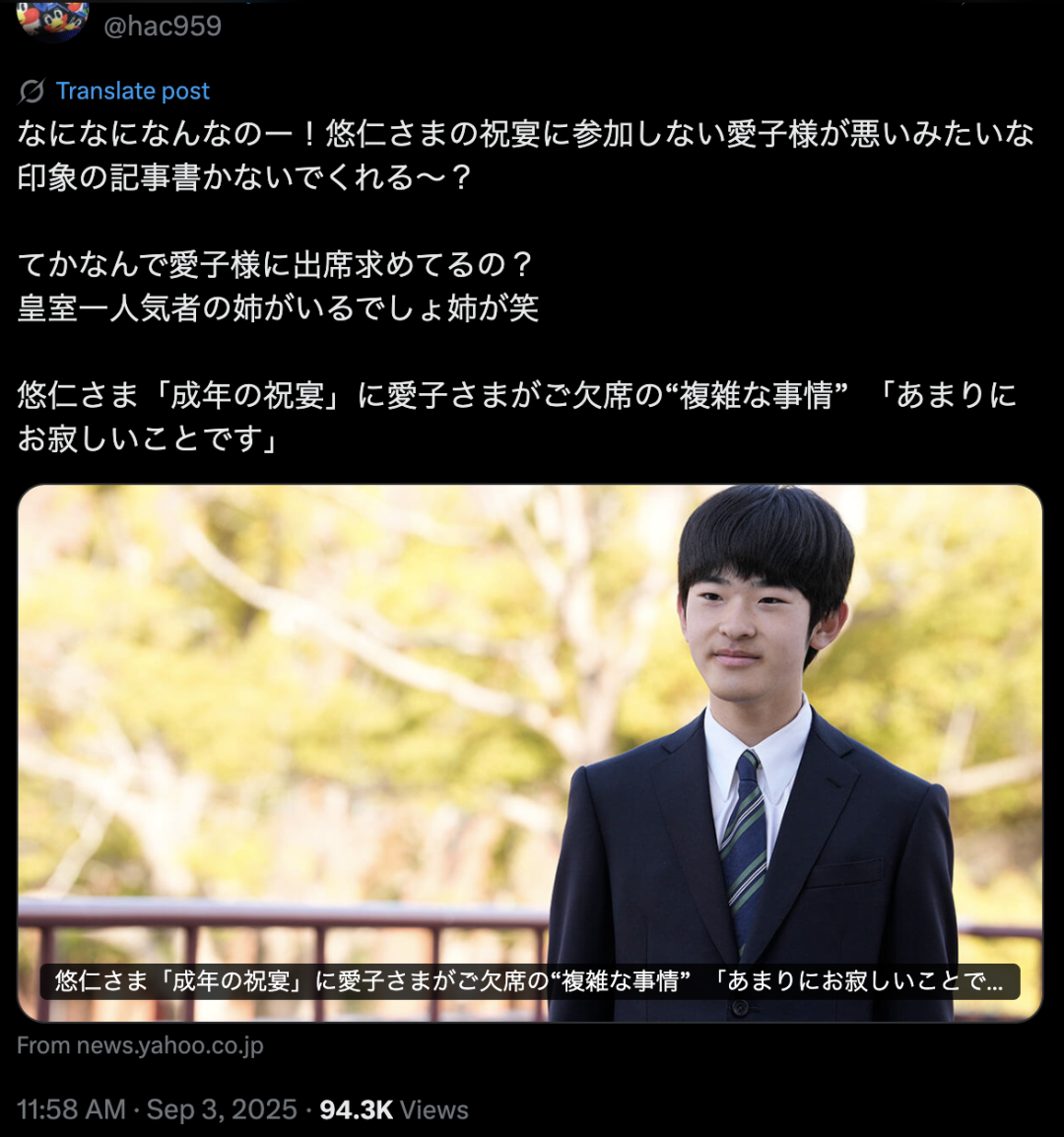 “搞什么嘛!请不要写那种好像把悠仁祝宴缺席的责任推给爱子公主的报道好吗?话说回来为什么非要要求爱子公主出席啊?皇室里不是还有那位超有人气的姐姐在嘛?让姐姐去不就好啦。”