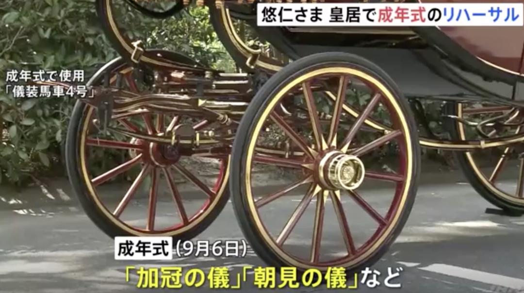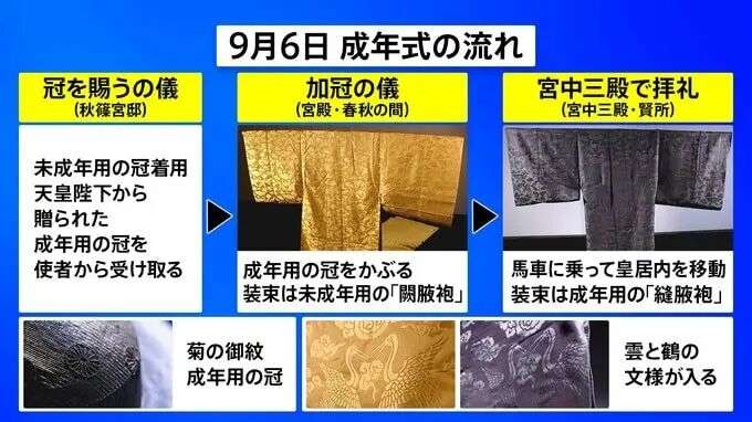 9月6日当天,悠仁穿传统装束接受赐冠之仪,再进行佩戴成人冠冕的加冠之仪,接受象征成年的冠冕,参拜宫殿,换西式服装向天皇皇后致意的朝见之仪。