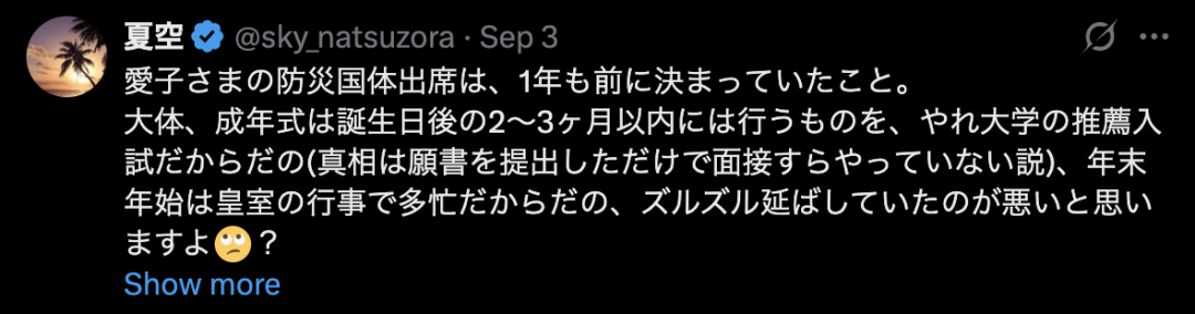 “爱子公主出席国民体育大会防灾会议一事,其实早在一年前就已确定。说到底,成年礼本应在生日后两三个月内举行,却以大学推荐入学考试为由(有说法称其实只是提交了申请材料,连面试都未进行),又说年末年初皇室活动繁忙,这样拖拖拉拉推迟日程才是问题所在吧。”