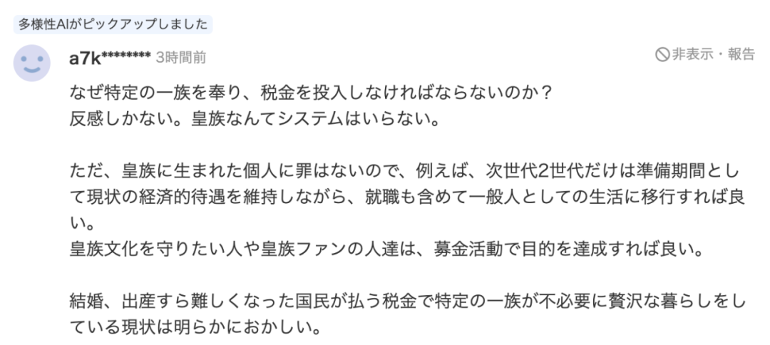 “为什么必须供奉特定家族并投入税金?我只有反感。皇室这种制度不该存在。当然,生在皇族的个人没有罪。比如可以给两代人作为过渡期,维持目前的经济待遇的同时,帮助他们(包括就业)过渡到普通人的生活。