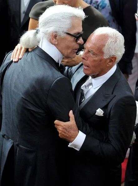 伤愈后,阿玛尼老爷子首度亮相,紧紧牵住设计师潘塔利奥Pantaleo Dell'Orco,一度和娜姐位列最有可能的接棒人。