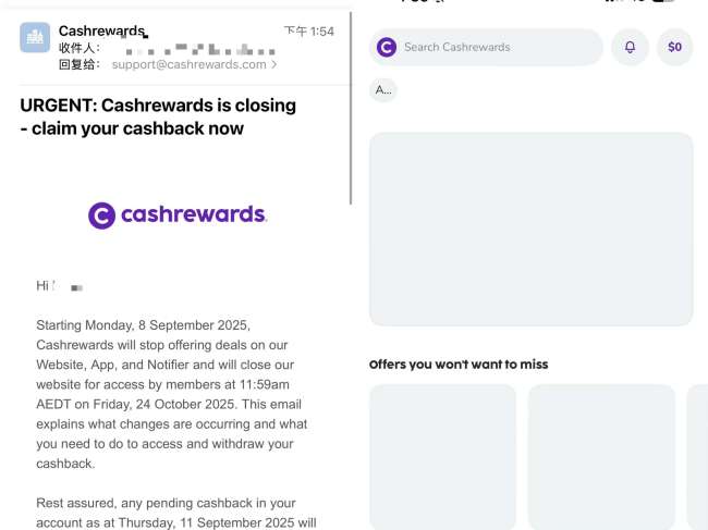 收藏突发!澳洲知名购物平台Cashrewards宣布关闭!用户集中提现致系统崩溃