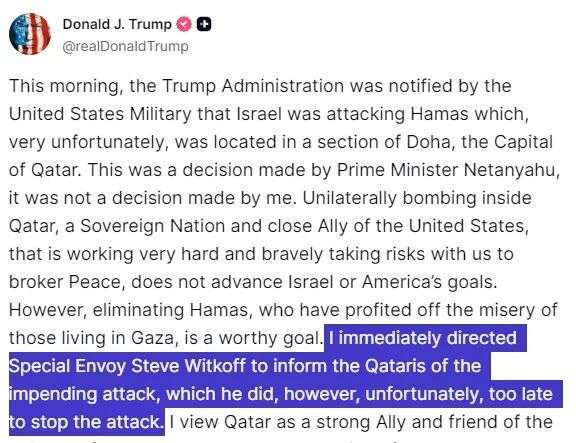 特朗普在社媒平台上写道,他立即指示美国中东问题特使威特科夫通知卡塔尔袭击即将发生,“然而,不幸的是,已经太晚了,无法阻止袭击”。
