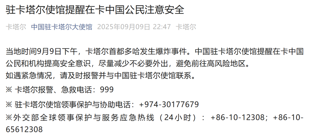中国驻卡塔尔使馆提醒在卡中国公民和机构提高安全意识,尽量减少不必要外出,避免前往高风险地区。如遇紧急情况,请及时报警并与中国驻卡塔尔使馆联系。