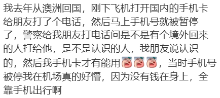另一位网友则表示,自己去年从澳大利亚回国后,刚启用国内手机卡联系朋友,号码便被暂停服务。