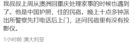有网友称,其叔叔上周从澳大利亚返回重庆处理家事,入住民宿后也接到派出所民警的电话,随后民警上门进行核查,而其叔叔同样持有中国护照。