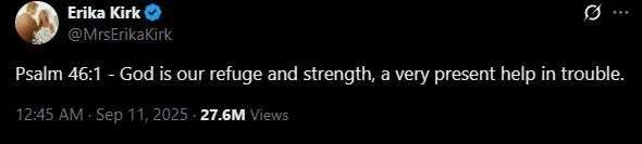 在Kirk死后,他妻子在社交媒体上暂时没做回应,但值得一提的,她在丈夫去世前几个小时刚刚发了一段圣经: