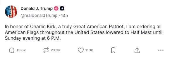 最新消息是,特朗普还表示要追授Kirk总统自由勋章,也算是相当高规格了。