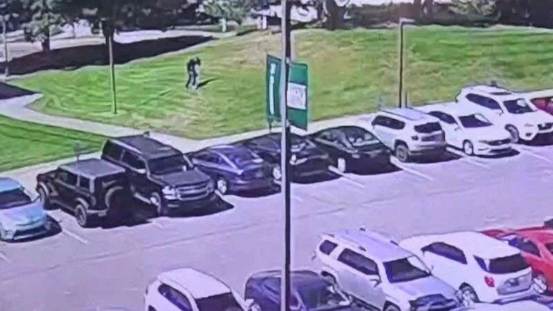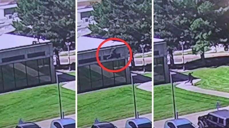 美国警方公布的最新录像显示,命中目标后,嫌疑人从屋顶跳下,穿过草坪,消失在树林中。