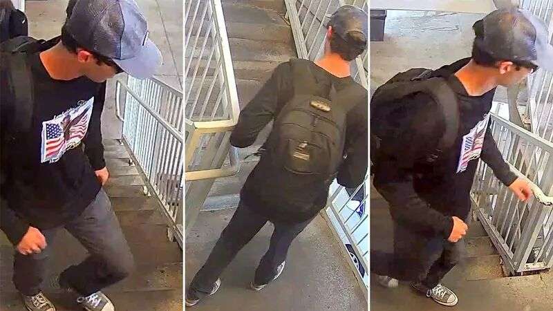 更清晰的画面显示,嫌疑人戴着鸭舌帽,背着包,穿着帆布鞋,像一个大学生的样子。