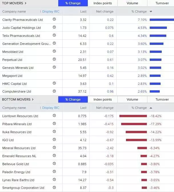 矿业公司股价纷纷下跌:Pilbara Minerals下跌17.3%,Liontown下跌近18.4%,IGO下跌14%,Mineral Resources下跌6.3%,力拓(Rio Tinto)和必和必拓(BHP)的股价也出现明显下跌。