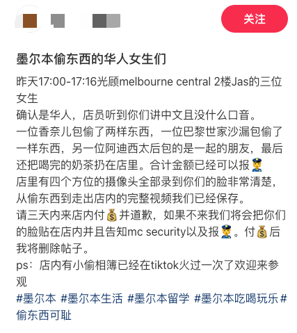 一位店主公开点名,三名中国女生在 Melbourne Central 二楼的 Jas 店公然偷东西,还留下了清清楚楚的证据!