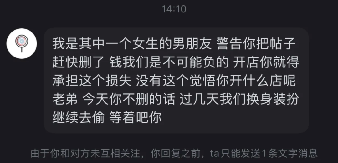 “警告你赶紧删帖,钱我们不可能赔!开店你就得承担损失,没有这个觉悟开什么店?今天你不删,过几天我们换身装扮继续去偷!等着吧!”