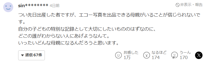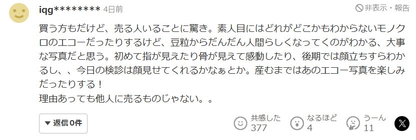 我也是不久前才刚生完孩子,但得知竟然会有母亲把B超照片拿去出售,实在令人难以置信。