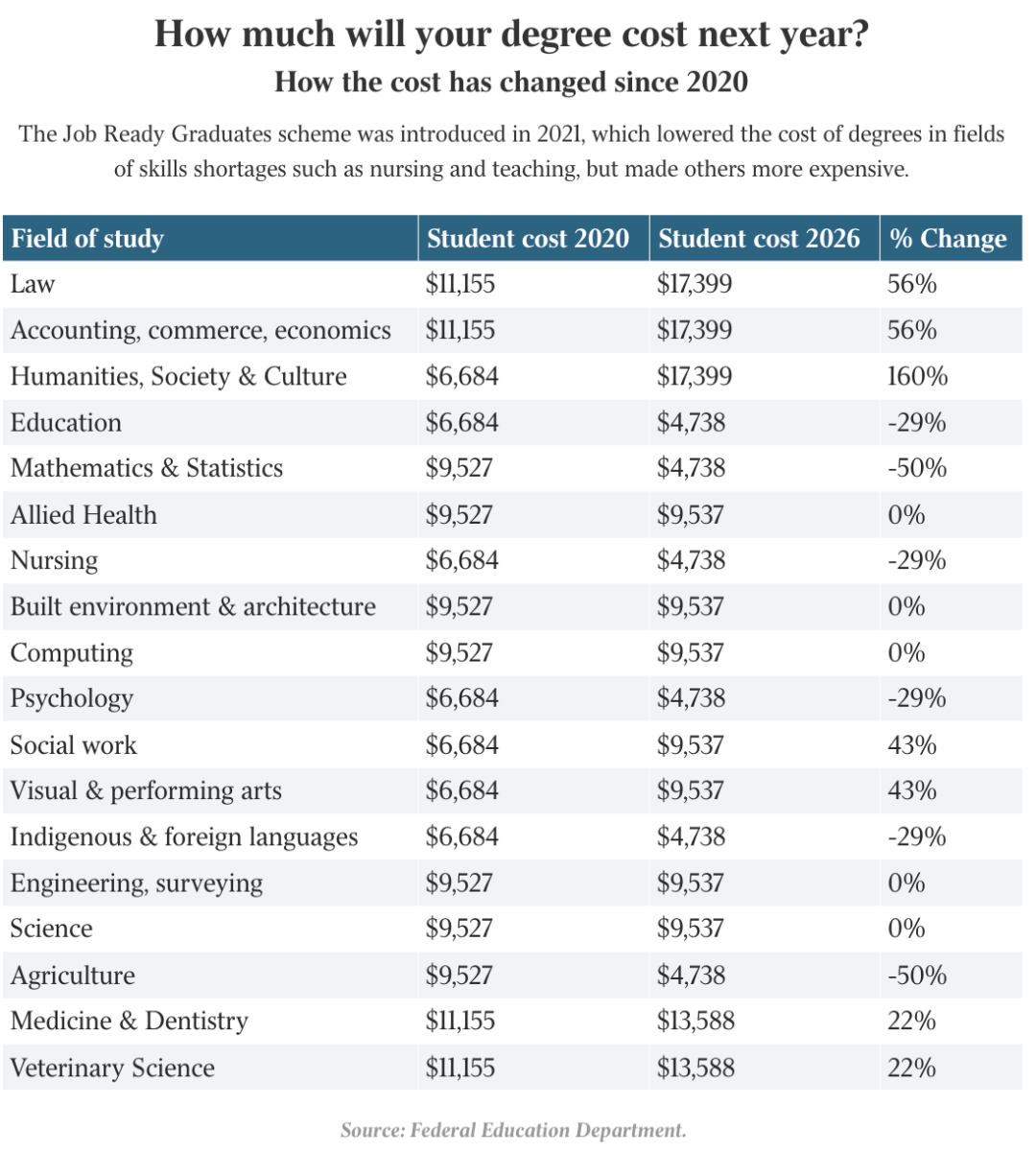 一门为期三年的艺术或商科学位将花费学生超过52,000澳元。