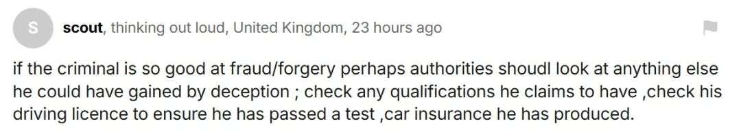 “如果这名罪犯如此擅长欺诈和伪造,也许当局应该查查,他是否通过欺骗获得过其他利益。核查他自称拥有的所有资格证书,查他的驾照,确保他真的通过了考试,以及他的汽车保险。”