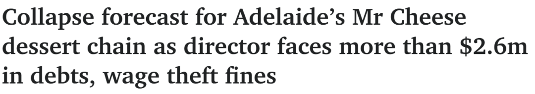 阿德莱德知名芝士蛋糕连锁店 Mr Cheese 面临倒闭危机,其董事Tao Liu及关联公司总负债超 260 万澳元。南澳就业法庭裁定,Mr Cheese Central Kitchen 和Tao Liu须向三名员工支付 83.5 万澳元的工资、加班费、年假和退休金。过去 10 个月内,他已拖欠债权人逾 180 万澳元,名下 7 家公司先后清算,包括 Burnside Dumplings、Hindley Dumplings、Vivid Pastries(Heidelberg Cakes)等。