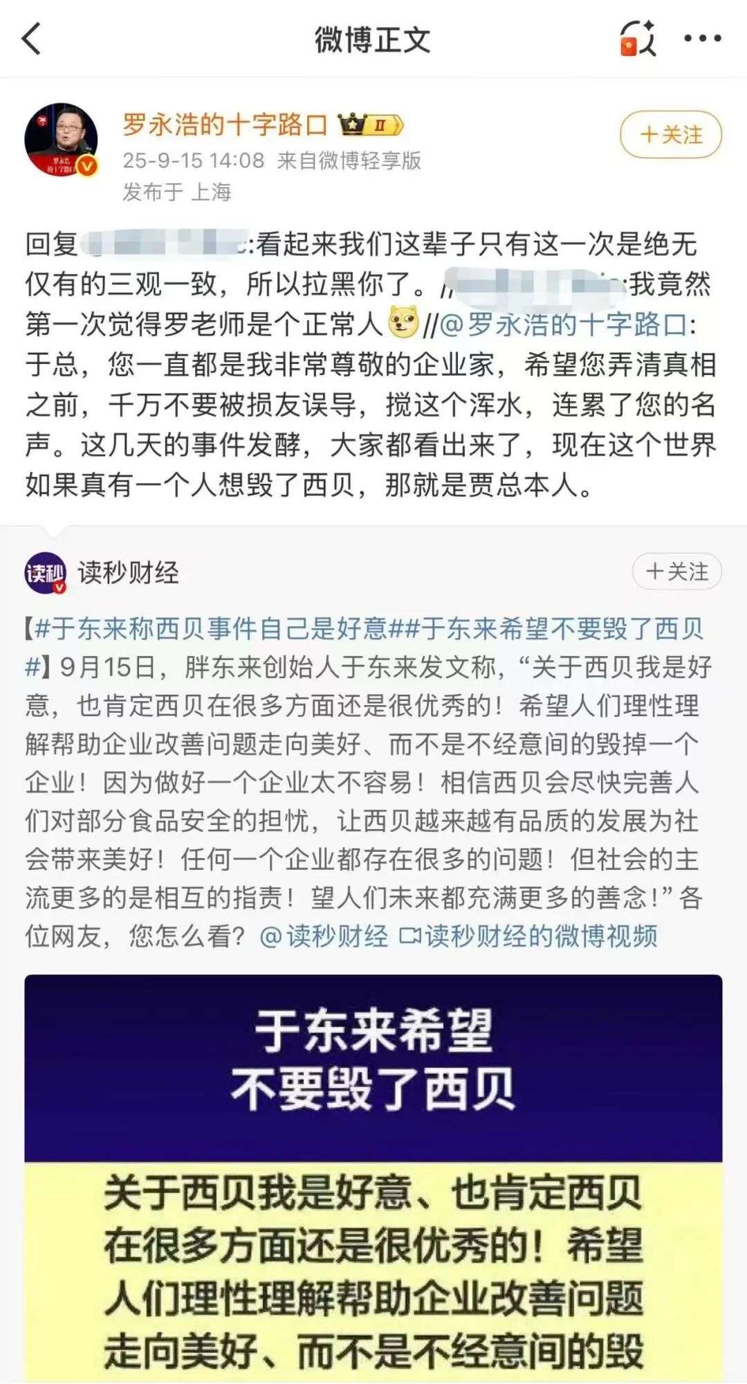 罗永浩9月15日再发声,对于胖东来创始人的于东来对西贝事件的发文,罗永浩称:“于总,您一直都是我非常尊敬的企业家,希望您弄清真相之前,千万不要被损友误导,搅这个浑水,连累了您的名声。这几天的事件发酵,大家都看出来了,现在这个世界如果真有一个人想毁了西贝,那就是贾总本人。”