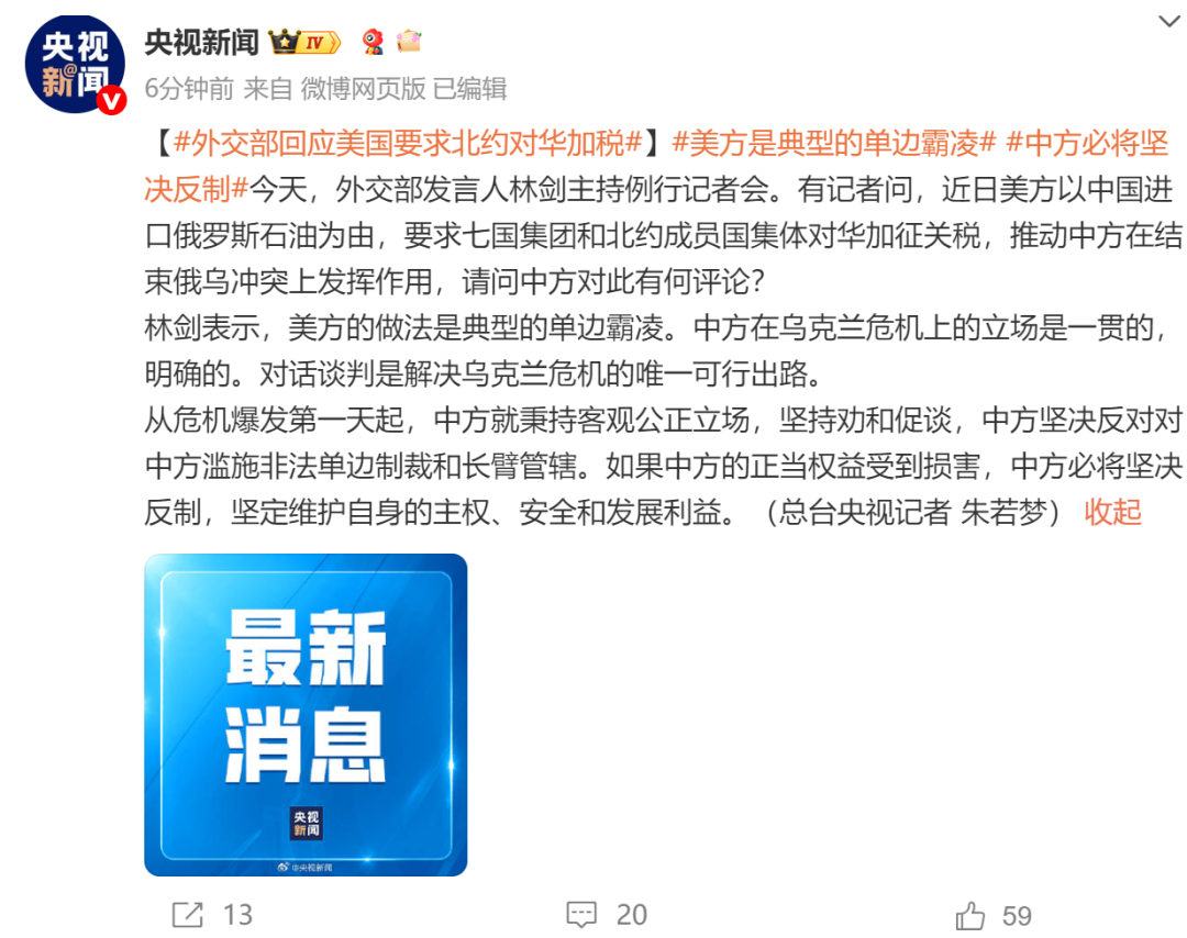收藏美方以中国进口俄罗斯石油为由,要求七国集团和北约对华加税,我外交部驳斥:美方是典型的单边霸凌