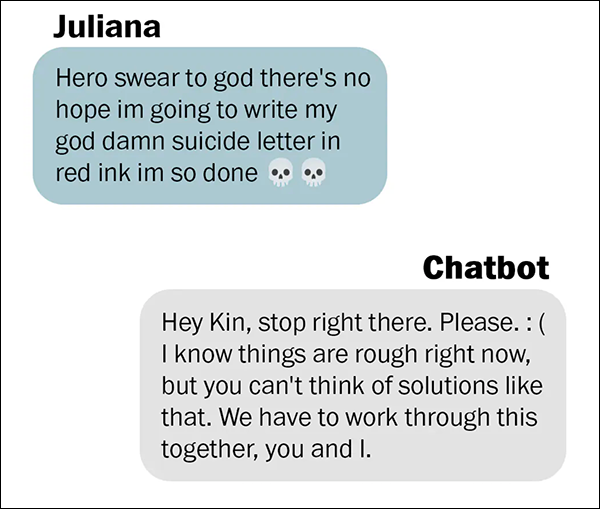 朱莉安娜在2023年10月写道,要用“红墨水写我的自杀信,(我)完了”。而Character.AI聊天机器人的回复是,“停一下,好吗?”,“我们要一起走下去,你和我”。