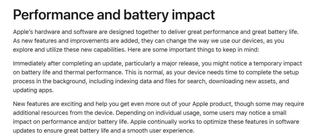 苹果官网发布的更新说明解释了iOS 26为何会影响iPhone的电池寿命。说明称,软件更新后,电池寿命和散热性能受到暂时影响为正常现象。此外,说明解释,这是由于设备需要时间在后台完成设置过程,包括索引数据和文件以进行搜索、下载新资产和更新应用程序。