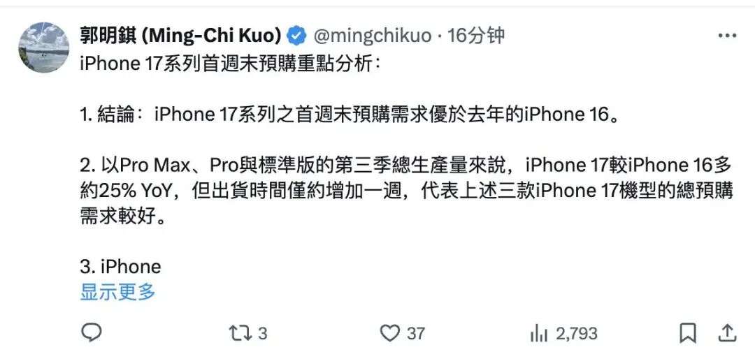 郭明錤近日在X上发帖称,从Pro Max、Pro与标准版的第三季度总生产量来看,iPhone 17较iPhone 16同比增加约25%,但出货时间仅延长约一周,代表上述三款iPhone 17机型的整体预售需求更好。