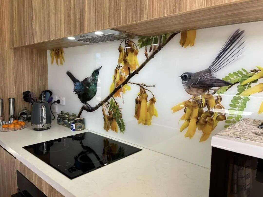 电动智能百叶窗、一整面绘有tūī和fantail的彩绘玻璃挡板、每卷200纽币的蕨类图案壁纸、全屋定制的缓冲抽屉和收纳空间。