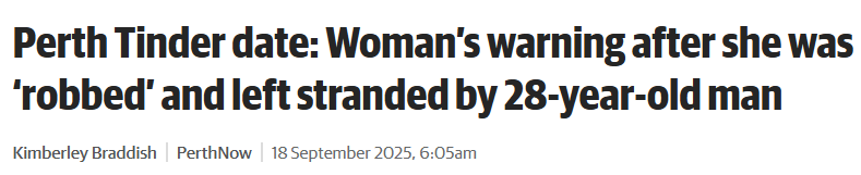 素材来源:https://www.perthnow.com.au/news/australia/perth-tinder-date-womans-warning-after-she-was-robbed-and-left-stranded-by-28-year-old-man-c-20056815