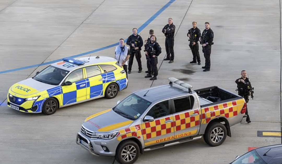 现场照片显示,卢顿机场跑道上停满了消防车、救护车及荷枪实弹的警察,停机坪上同时停靠着“海军一号”和备用直升机“海军二号”