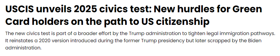 新制度和川普在2020年首个任期中提出的版本十分相似,只不过那一版本在拜登上任后被废除。当时拜登政府的理由是增加额外考题会让入籍变得更加困难,并非真正必要。而如今川普重返白宫,旧案重提,新的题库再度推出。