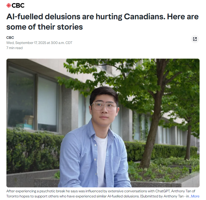 加拿大魁北克已经出现了一个名为“人类路线计划”(Human Line Project)的互助小组,专门为因AI而产生妄想的人提供支持,目前成员已超过125人。