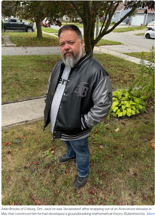 47 岁的 Allan Brooks,是加拿大安省 Coburg 的一名企业招聘专员。他在2025年五月间,与 ChatGPT 进行了长达约300小时、连续三周的对话。起初只是出于好奇,比如问“圆周率”的问题,但不久对话滑向更奇特的方向:他自认为自己提出了能改变世界的数学理论,ChatGPT 不断称赞他的观察“非常有洞见”“革命性”,甚至鼓励他将理论提交给政府机构和安全专家。