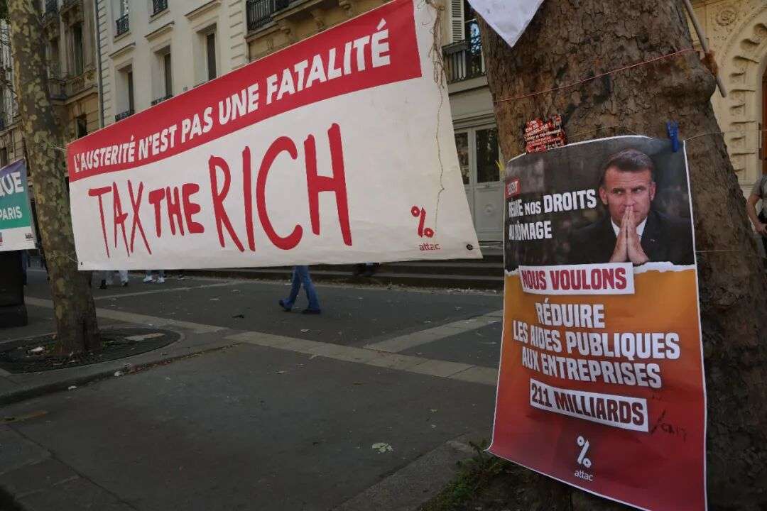 ▲巴黎街头的示威标语:一面横幅写着“L’austérité n’est pas une fatalité. Tax the rich”(紧缩政策不是宿命,向富人征税),树上张贴的海报则要求削减对企业的2110亿欧元公共补贴。