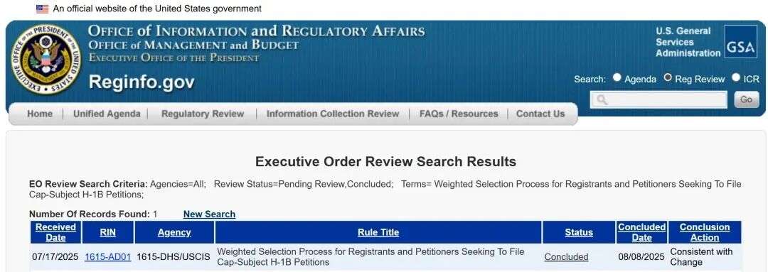 当地时间8月8日,白宫管理与预算办公室(OMB)正式完成了对“RIN 1615-AD01”H1B新法规提案的审查,预计很快将在《联邦公报》上正式公布,并进入公众评论期。
